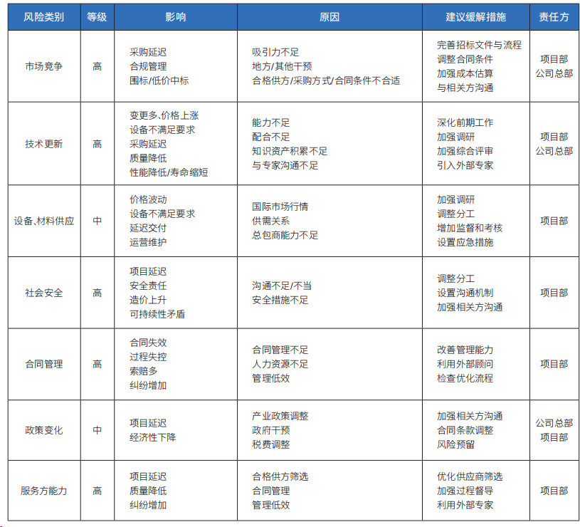 采购方案的成功与否很大程度上取决于企业的综合风险管理能力。在工程总承包的采购管理中,风险管理不仅应包括招标采购过程中可能遇到的风险因素,还需对后续履约过程中的关键风险点进行全面系统审视。