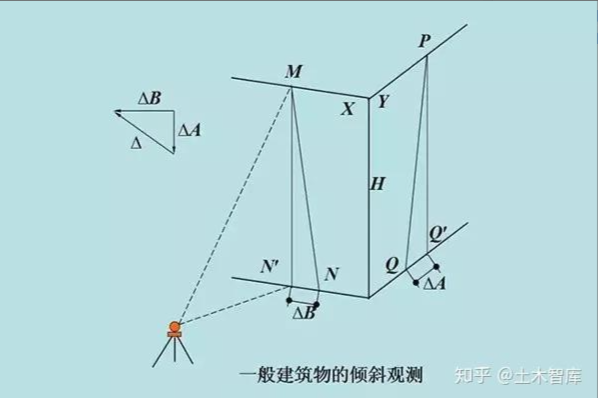倾斜测量主要是测定建筑物主体的偏移值ΔD。偏移值ΔD的测定一般采用经纬仪投影法。